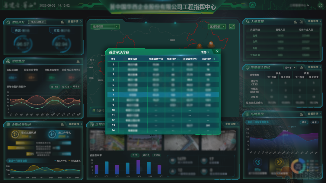 工程指挥调度对诚信评分、诚信管控、大型设备监控、环境监测、人员管理区域、质量安全巡检等多个模块进行数据集成,可多维度查询数据汇总分析结果,动态展示集团级下属各单位排名,还可实时推送预报警信息,实现对智慧工地各版块可视化监管。