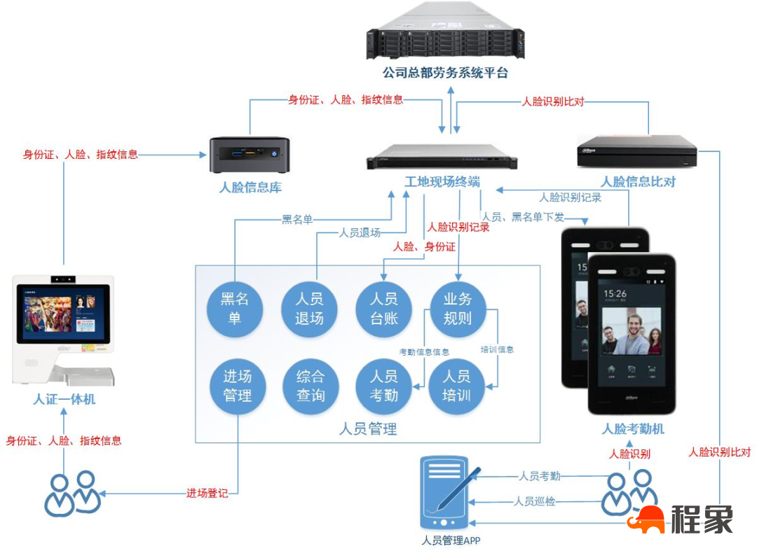 在公司本部建立系统主服务器,所有的最终数据存储在本部;项目现场部署工地现场终端,实现项目部数据本地化储存,为系统扩展提供接口;现场终端系统与认证一体机、人脸信息库、人脸考勤系统实现全面物联网互联,实现数据的自动采集、识别和判断。